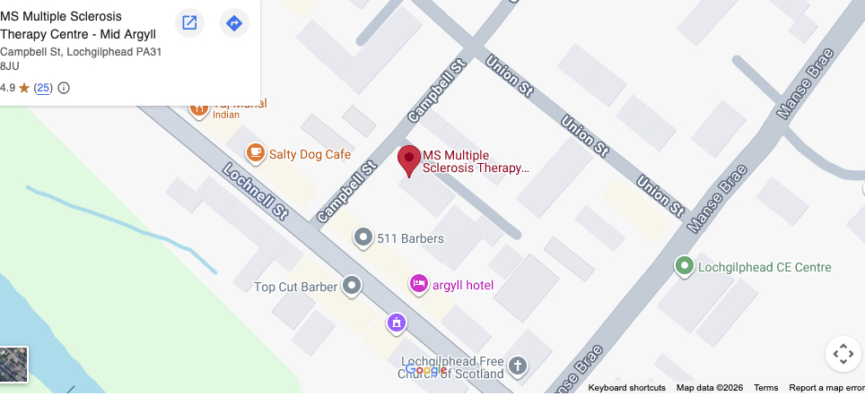 We meet in the Mid Argyll Snowdrop/MS Multiple Sclerosis Therapy Centre in Campbell St, Lochgilphead PA31 8JU.